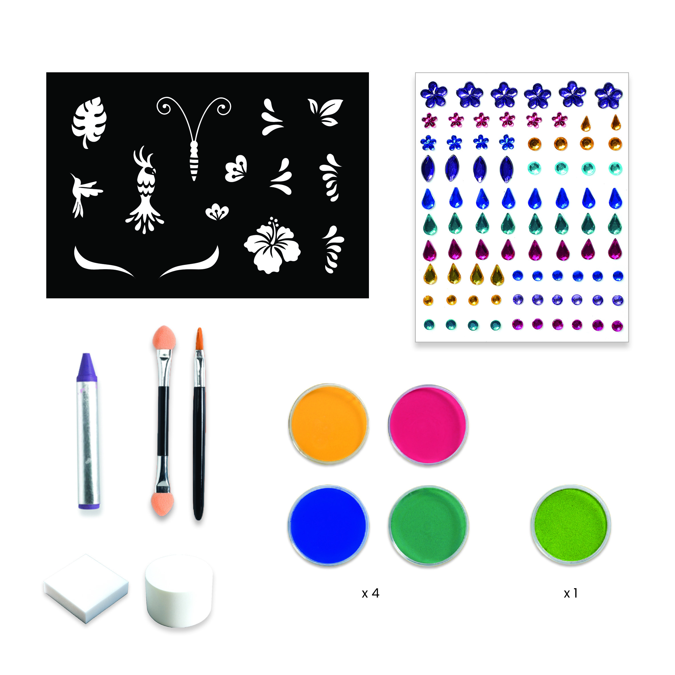 meikkisudin, 2 meikkisientä, pensselin, sabloonoita ja n. 40 strassia kiinnitettäväksi kasvoihin.