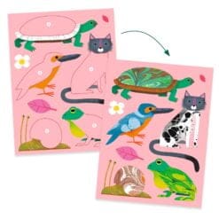 Askartelupaketissa on 4 eläinmaalauspohjaa ( 21 x 28 cm), 8 tarra-arkkia marmorointiin, muovinen marmorointikulho, 6 maalia, 3 pussia marmorointijauhetta, 3 puutikkua, 1 muovinen väripaletti, muovinen suoja-alusta,5 arkkia valkoista ”kokeilupaperia”, vaihe vaiheelta ohjekirja.