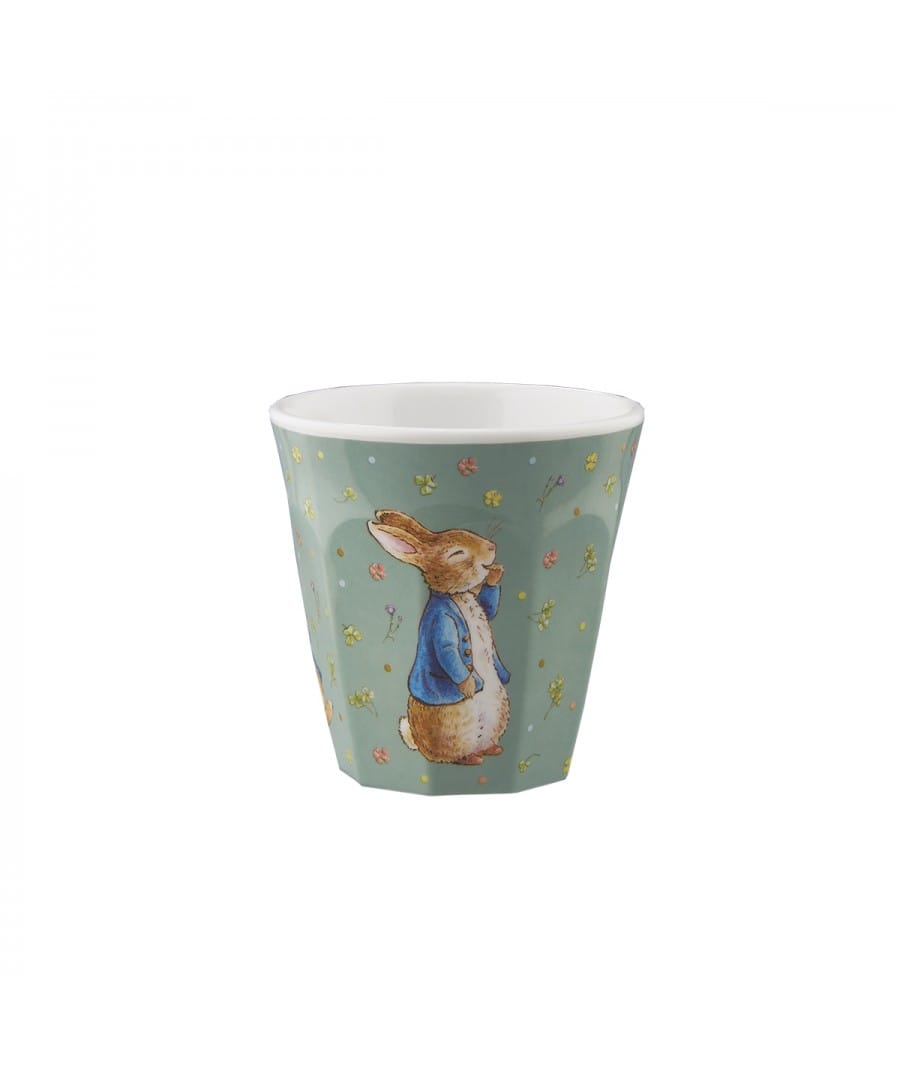 Melamiinisessa mukissa on kaunis Petteri Kaniini kuvitus, vihreällä pohjalla.