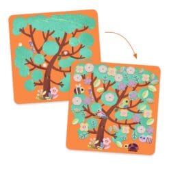 Djeco metsä- ja vuodenaika-aiheinen huopa-askartelu, jossa erimuotoisilla huopapaloilla koristellaan pohjia.