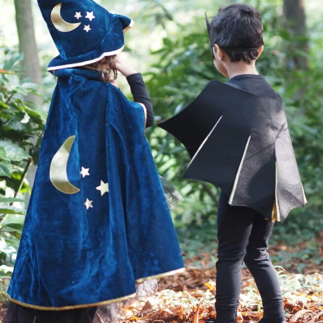 Asuun kuuluvat viitta, hattu ja taikasauva.