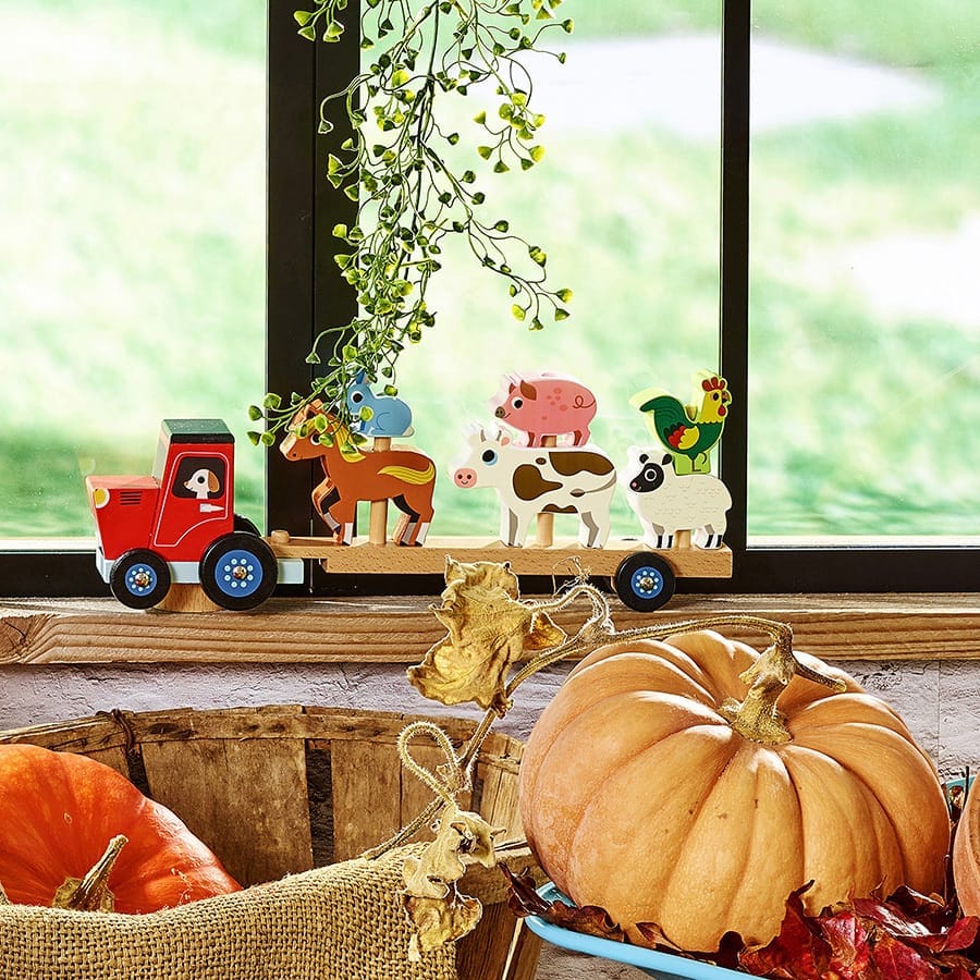 Sisältää traktorin lastausvaunuineen, sekä kuusi puista eläintä.